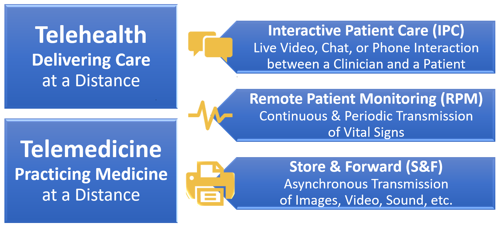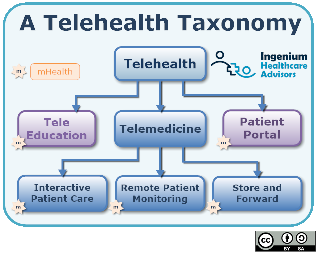 To understand the relationships of the various telehealth-related terms, consider the following taxonomy: